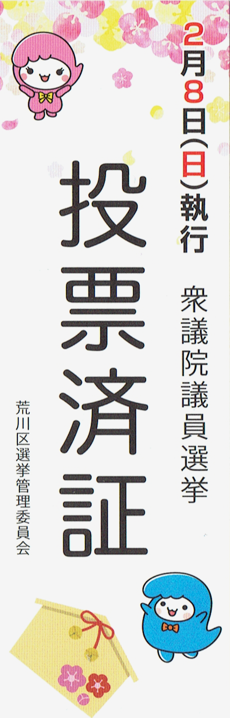 ・「投票済証」のもらいかた…投票所(期日前投票所も含む)にて、投票をした後に、投票所の係員に「投票済証を下さい。」とお声がけ下さい。荒川区の場合は、近年、しおり状の投票済証(毎回異なるデザイン)が頂けます。