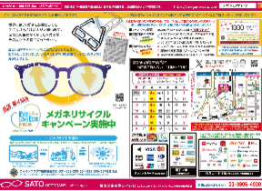 - 当店の最新広告(うら面)です。メガネリサイクルキャンペーンについてのお知らせ、当店の営業時間・休業日・ご利用頂けるお支払い方法についてのごあんないです。上の画像をクリックしますとjpg画像が開きます。